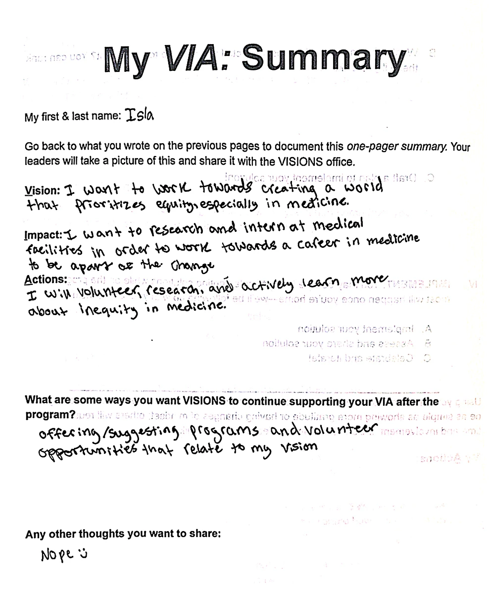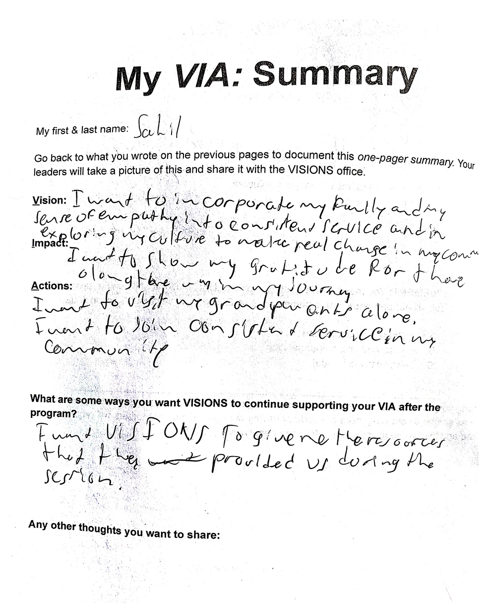 In Spanish, via means “the way.” In VISIONS programs, VIA stands for Vision, Impact, Action—a simple but powerful framework that helps teens articulate who they want to be in this world, the difference they hope to make, and the steps they can take to get there.