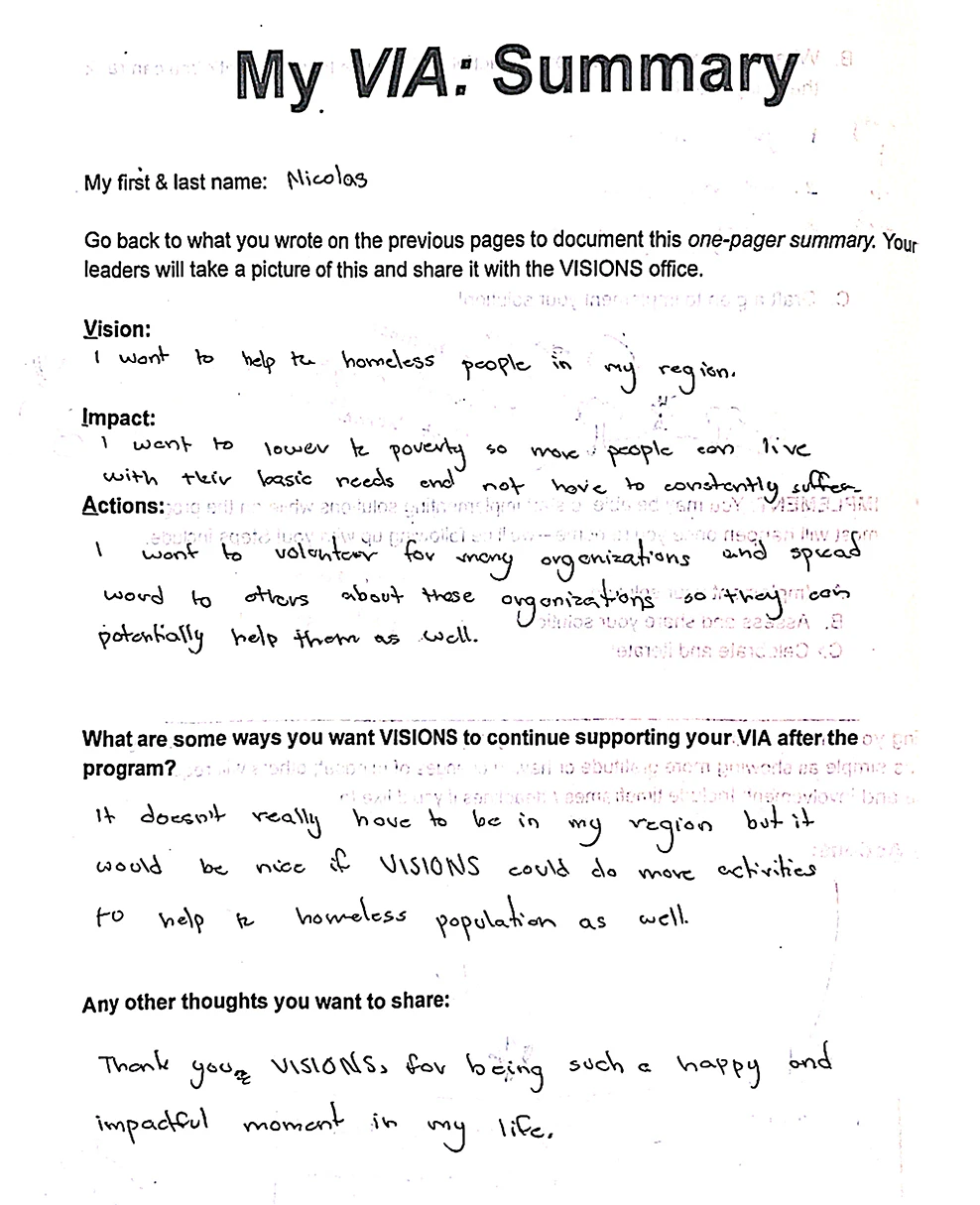 - Nicolas returned home determined to support the homeless community in his region. His VIA focuses on taking steps to reduce poverty and increase access to basic needs.